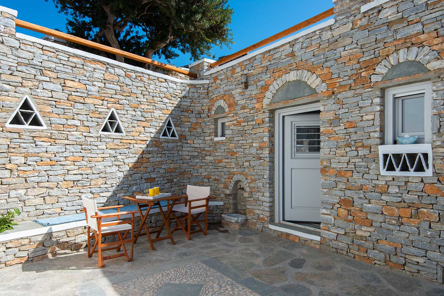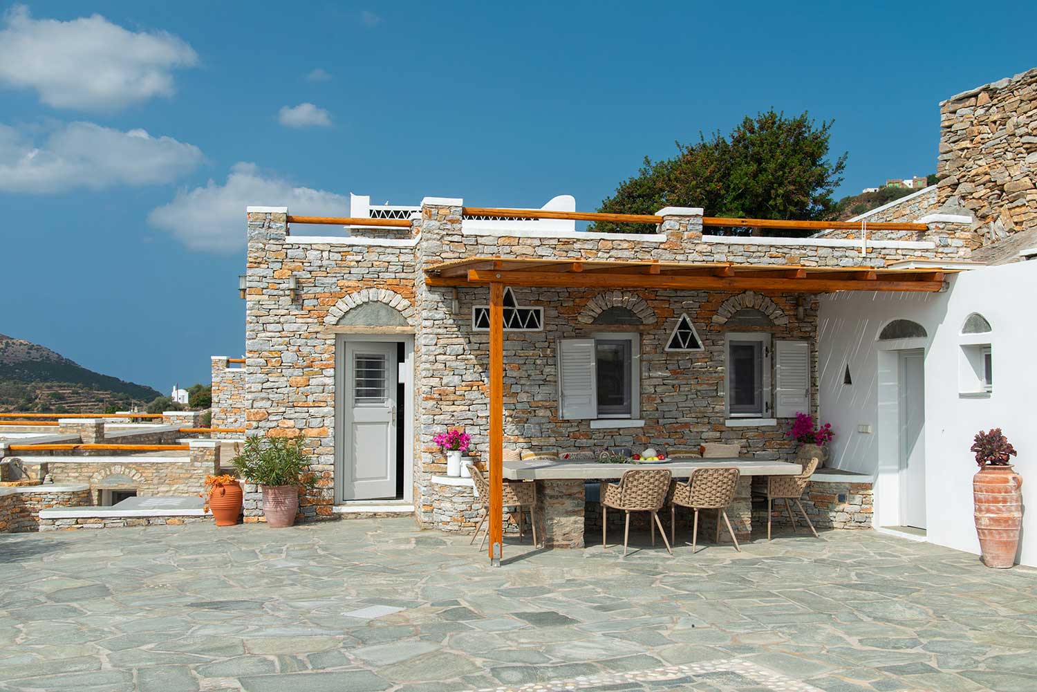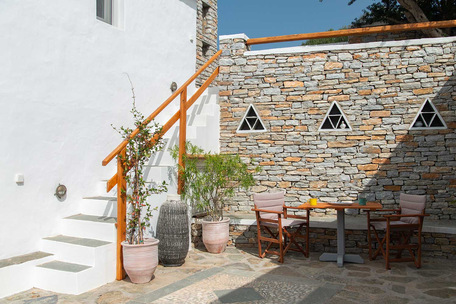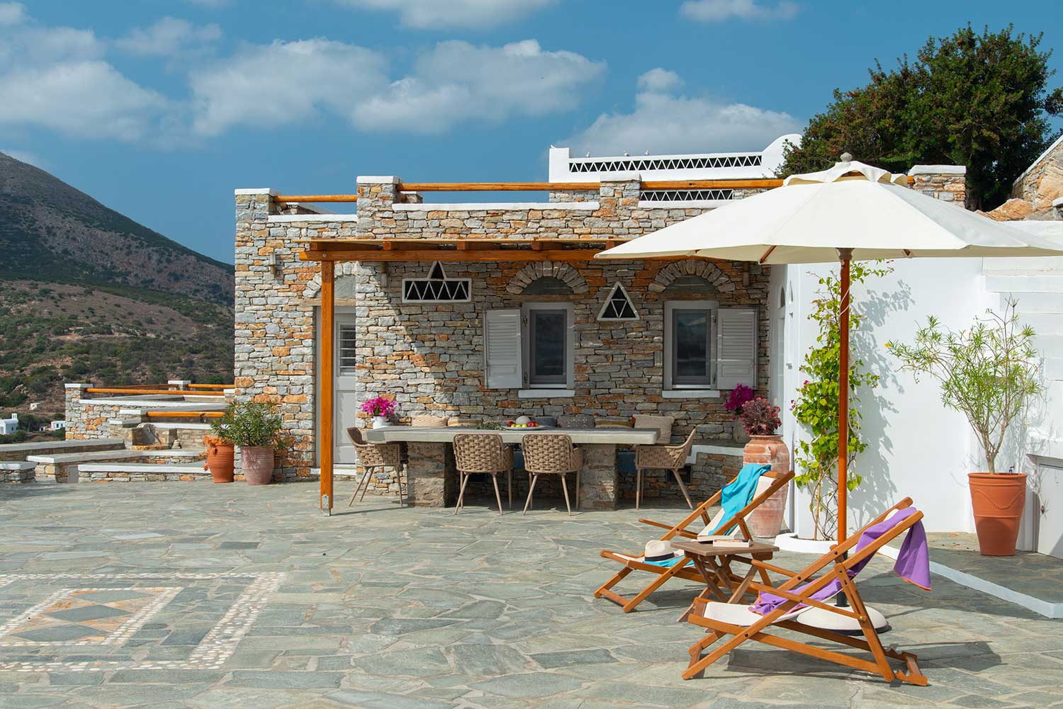 Στο εξωτερικό, μεγάλες αυλές λουσμένες από το φως του Αιγαίου, με έπιπλα εξωτερικού χώρου, ένα μεγάλο πέτρινο τραπέζι και ξαπλώστρες προσφέρουν ιδανικές γωνιές για χαλάρωση με θέα στον ορίζοντα.