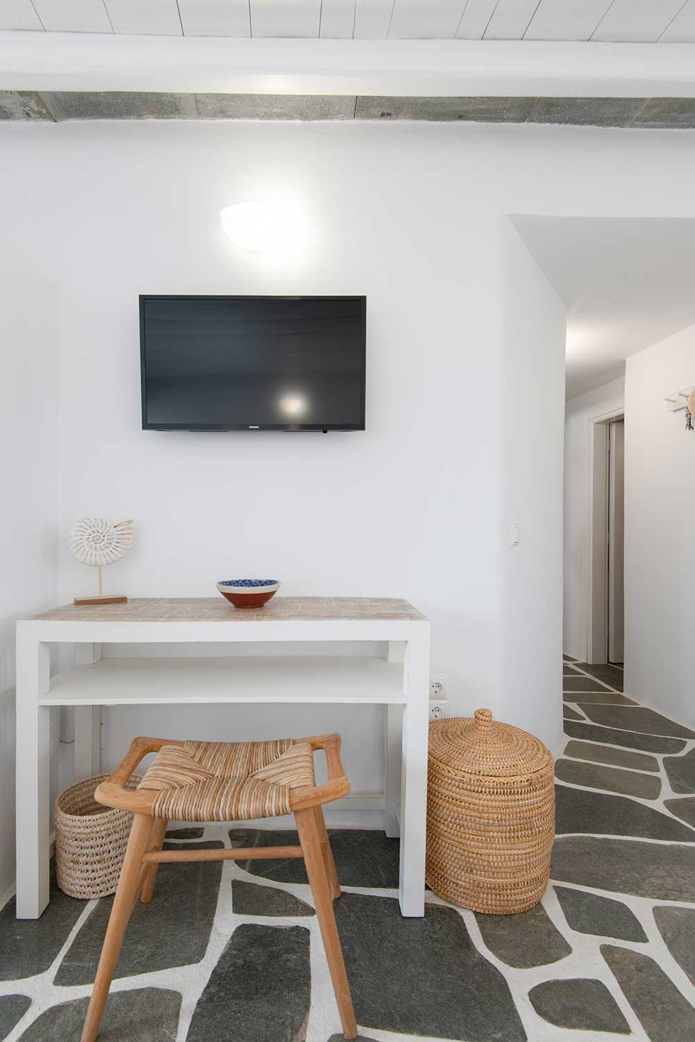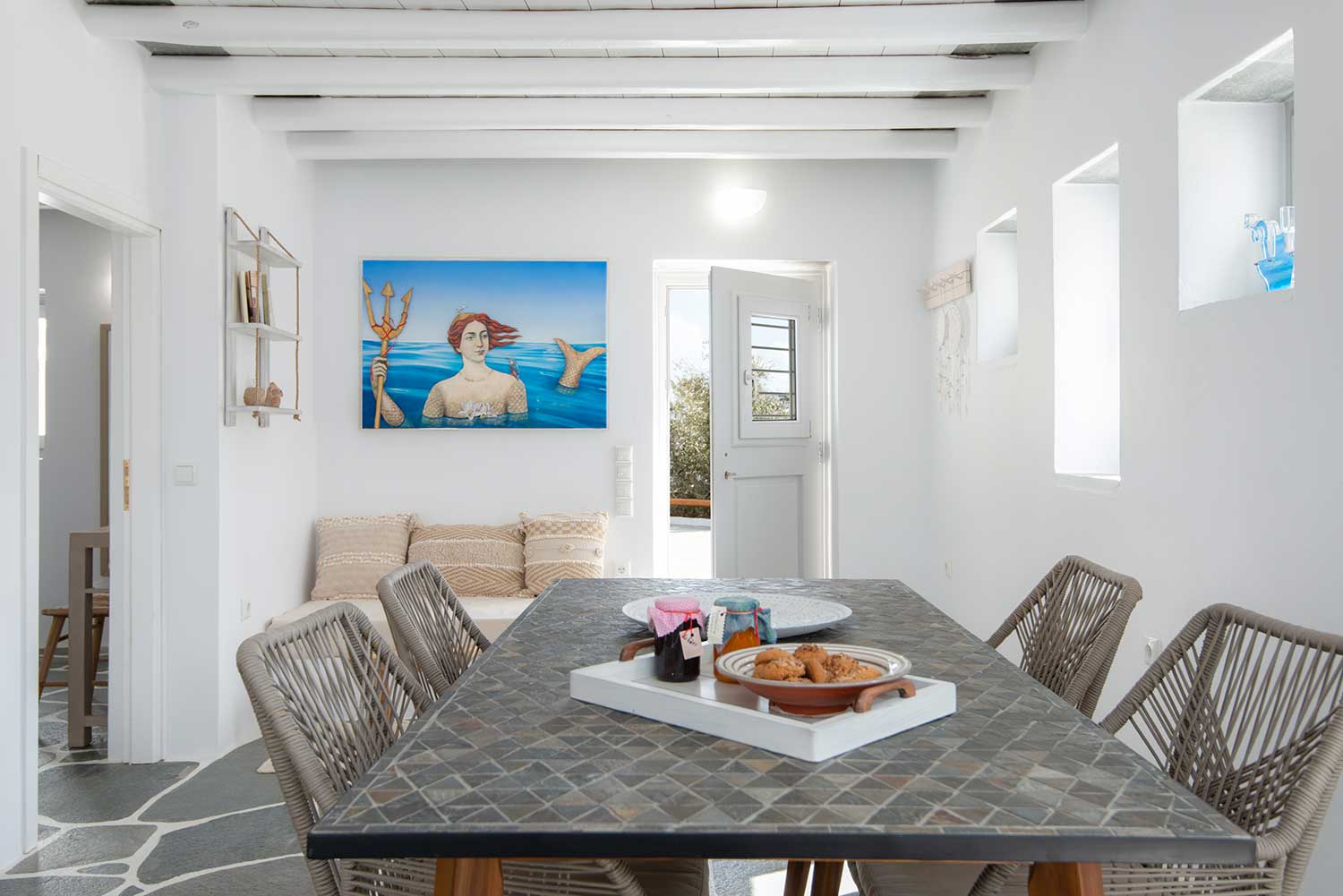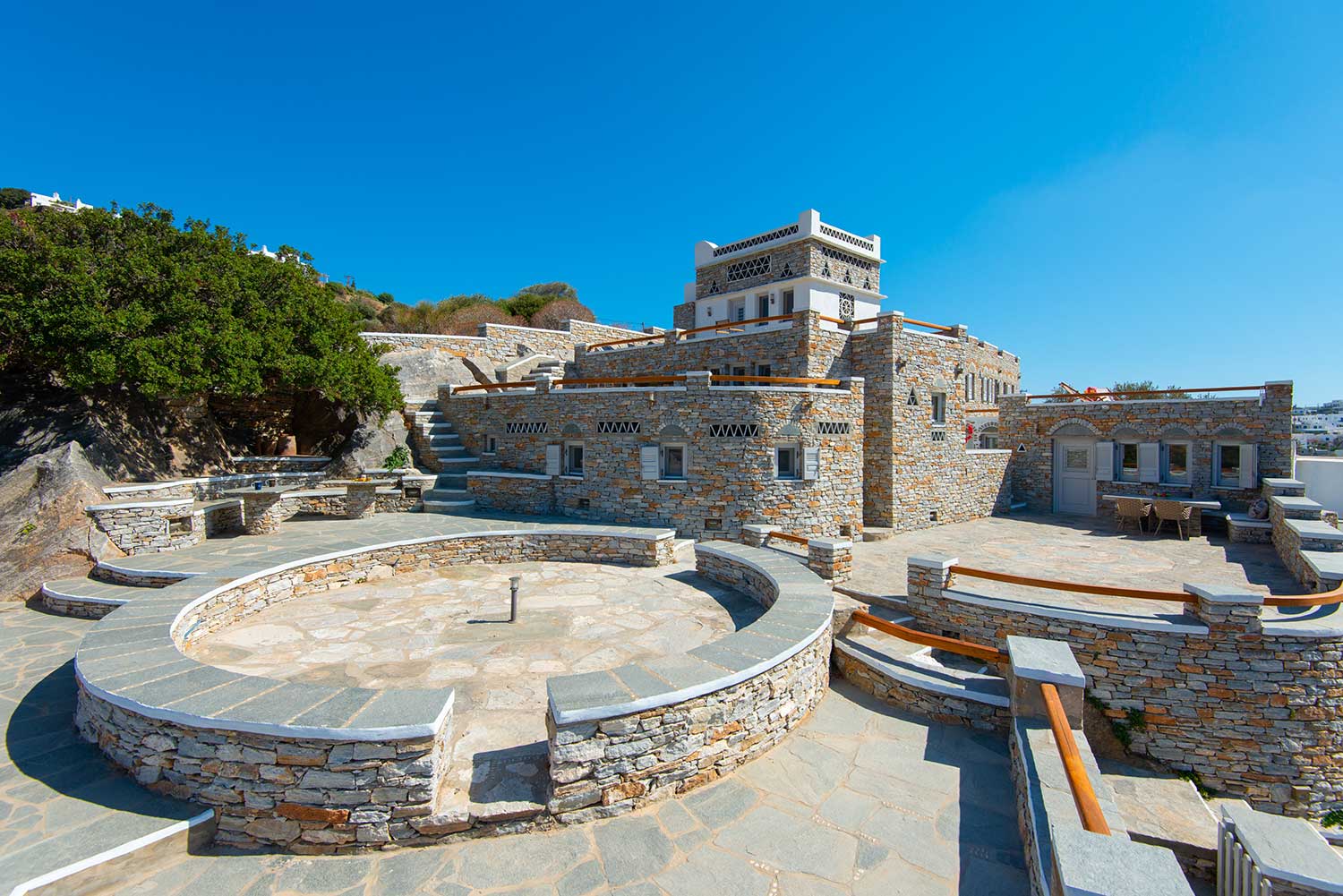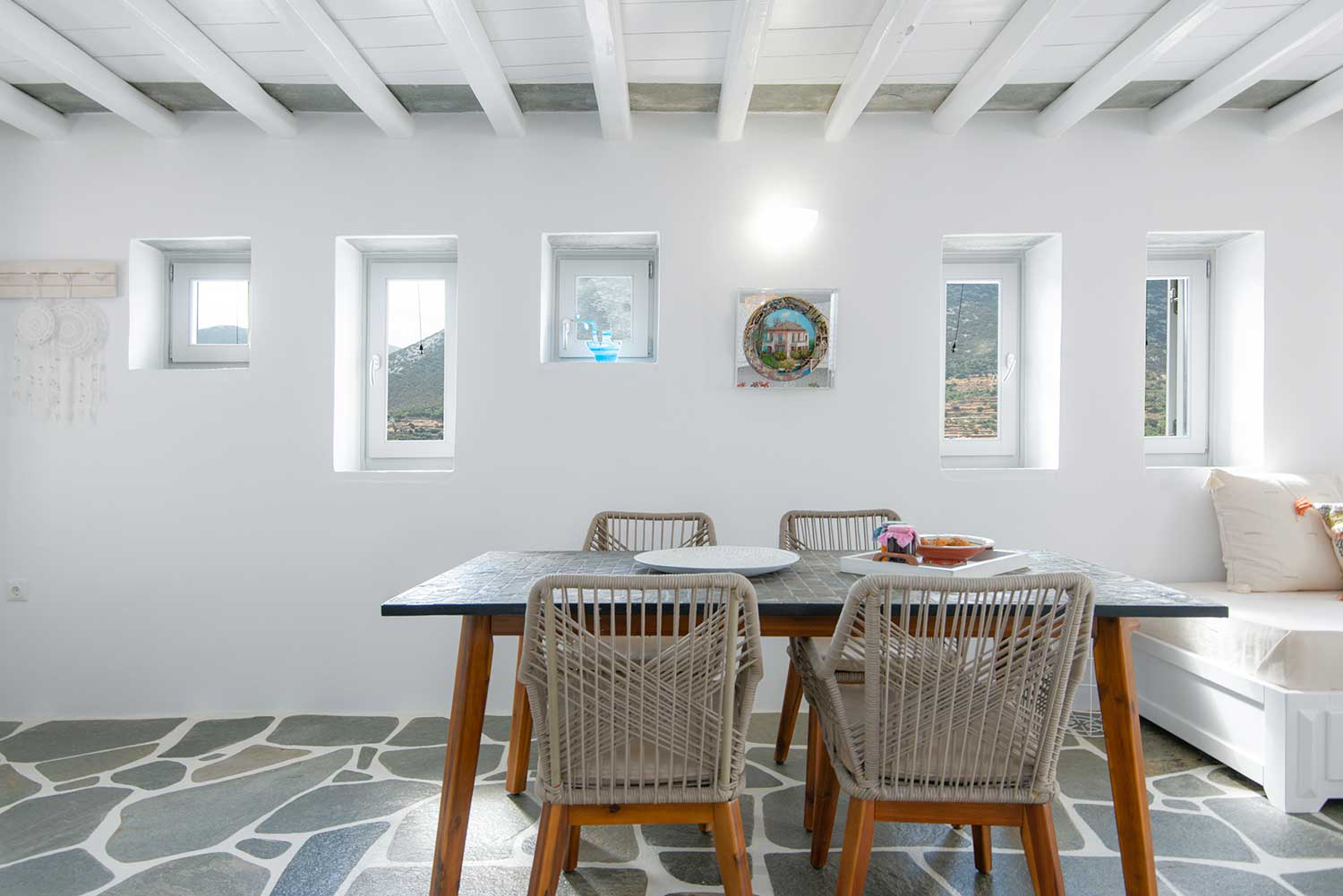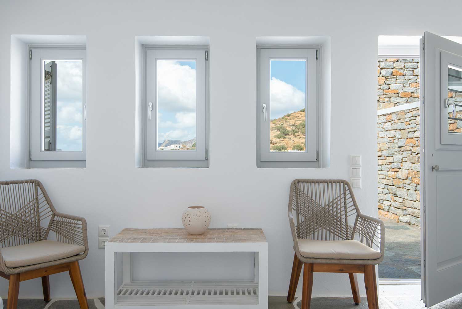Στο εξωτερικό, μεγάλες αυλές λουσμένες από το φως του Αιγαίου, με έπιπλα εξωτερικού χώρου, ένα μεγάλο πέτρινο τραπέζι και ξαπλώστρες προσφέρουν ιδανικές γωνιές για χαλάρωση με θέα στον ορίζοντα.
