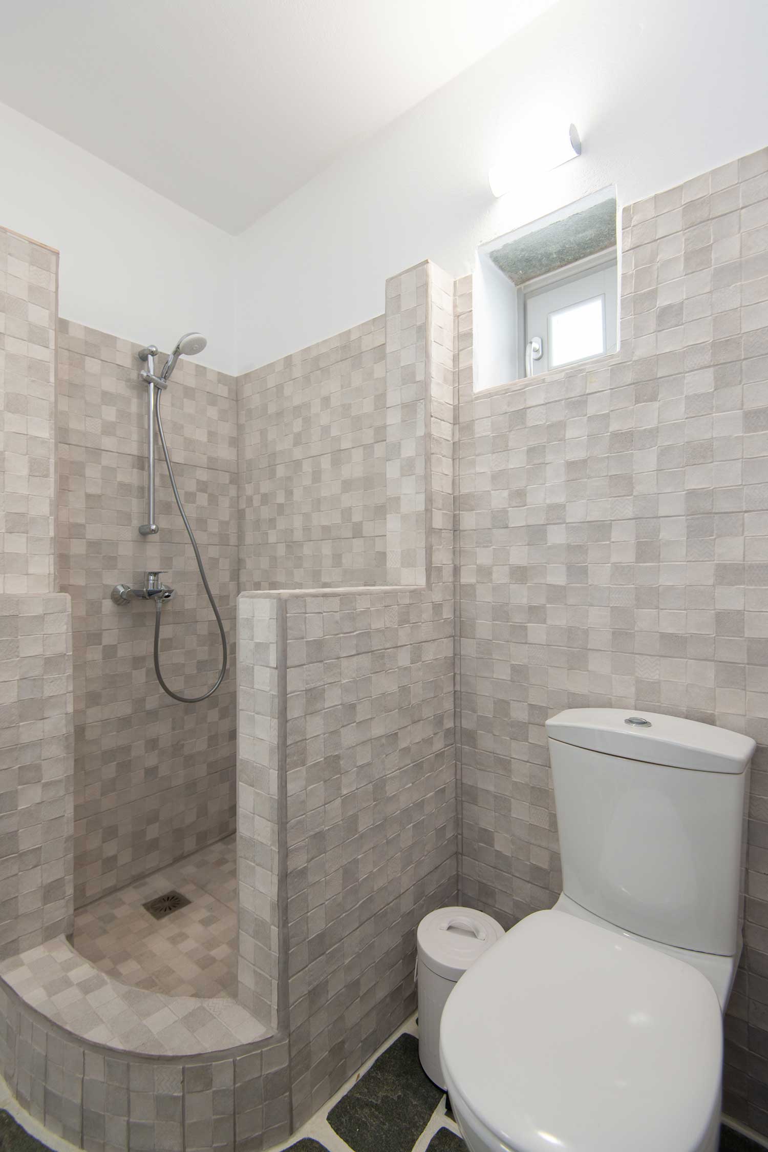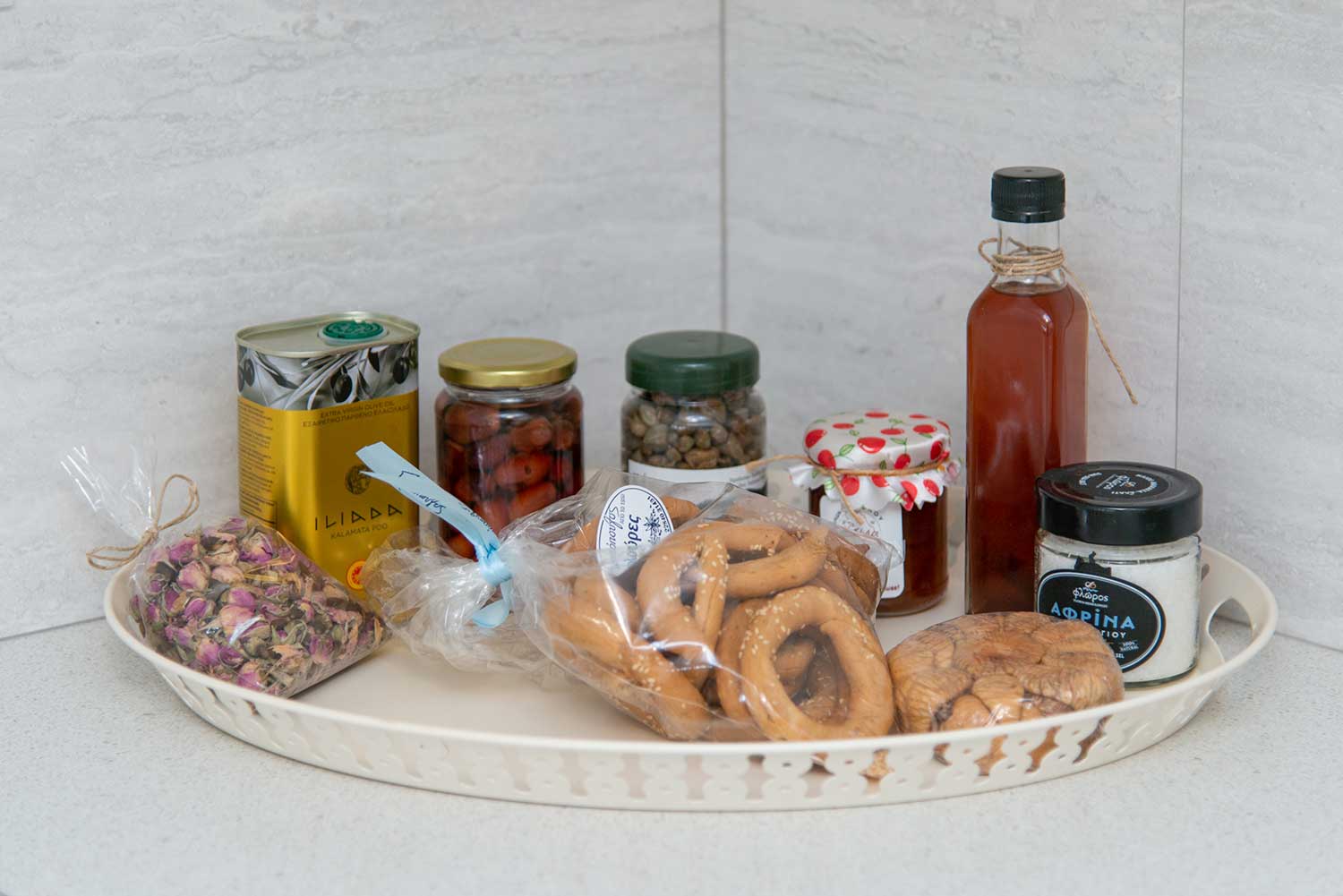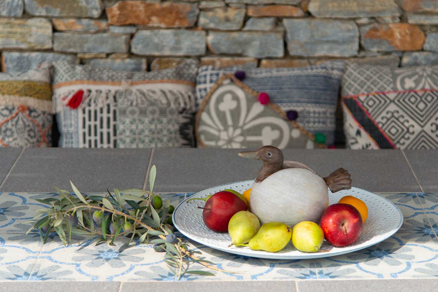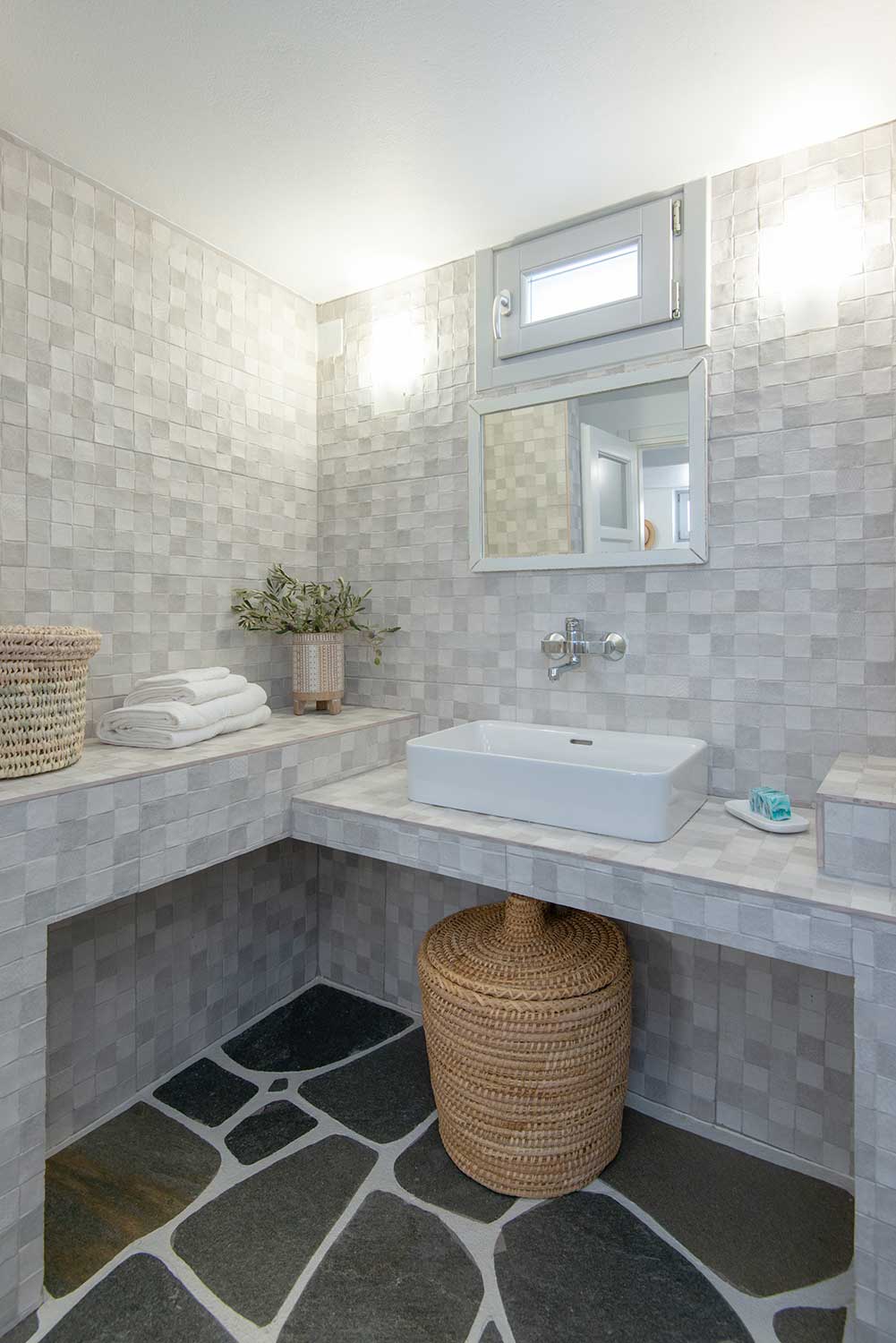 Στο εξωτερικό, μεγάλες αυλές λουσμένες από το φως του Αιγαίου, με έπιπλα εξωτερικού χώρου, ένα μεγάλο πέτρινο τραπέζι και ξαπλώστρες προσφέρουν ιδανικές γωνιές για χαλάρωση με θέα στον ορίζοντα.