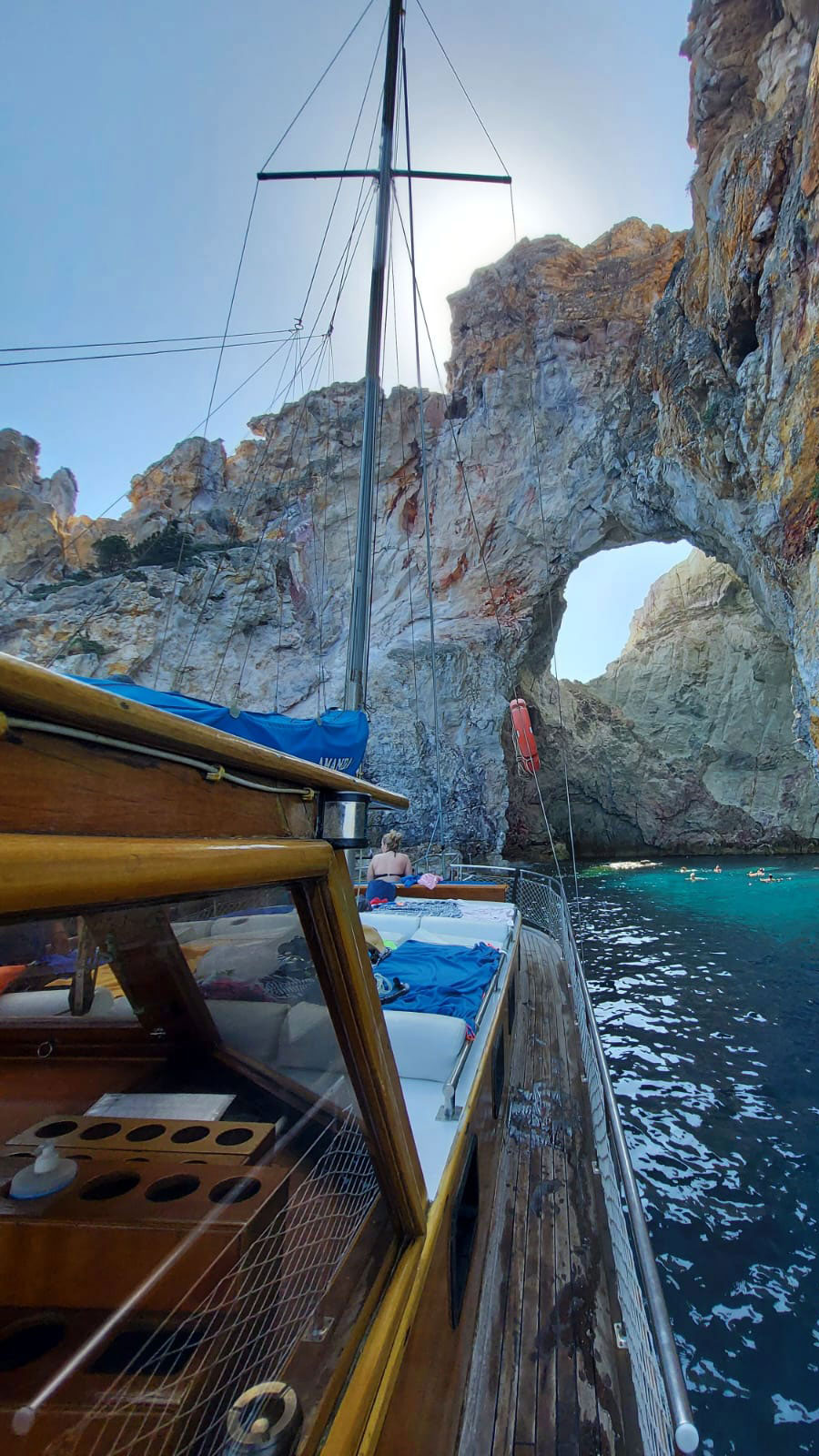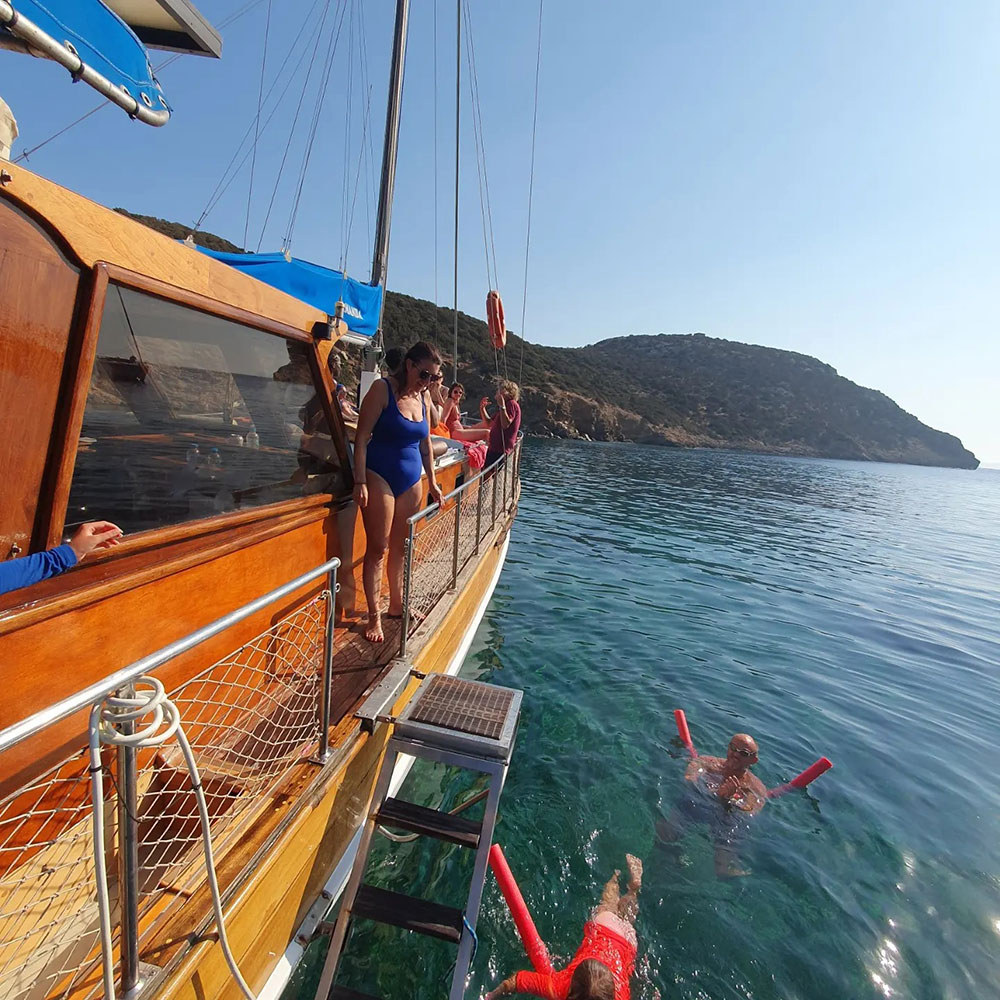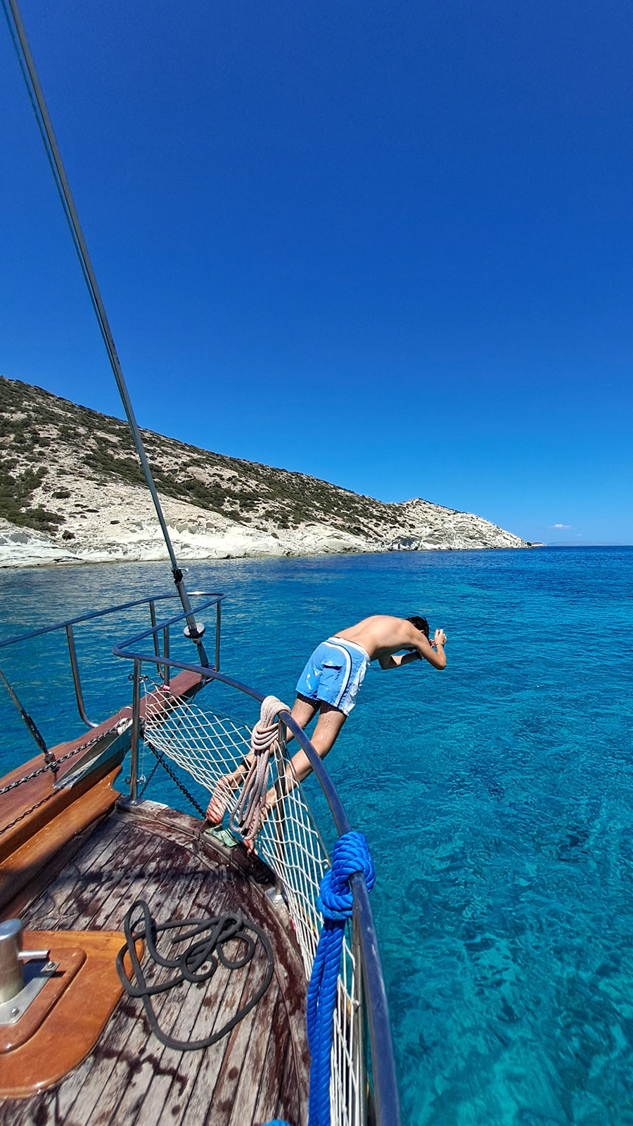Safety is always the number one priority on board. Fabio makes sure that all his guests feel completely at ease, taking great care to navigate in calm waters and stopping at some of the most stunning bays in the area, sheltered from the Aegean winds.