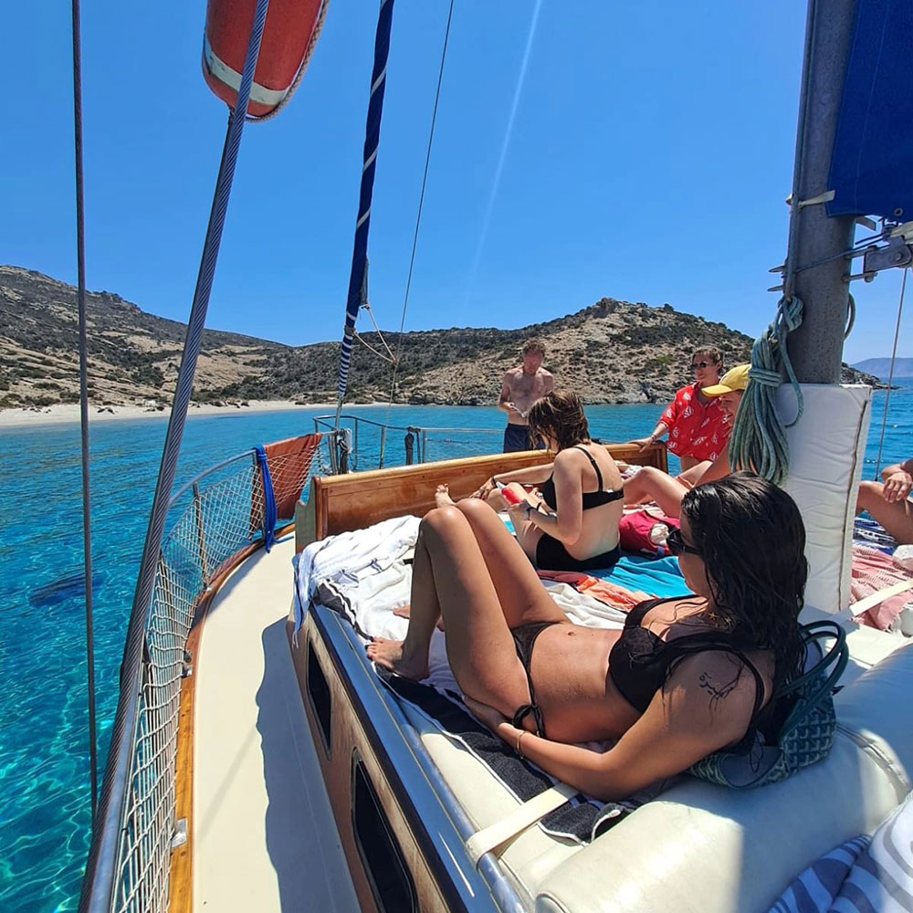 Amanda's wooden design and rich history make her a standout on the waters of Sifnos. From her smooth wooden deck to the spacious lounging areas, every detail reflects the traditional artistry of boat building, providing you with an authentic sailing experience that feels like stepping back in time.
